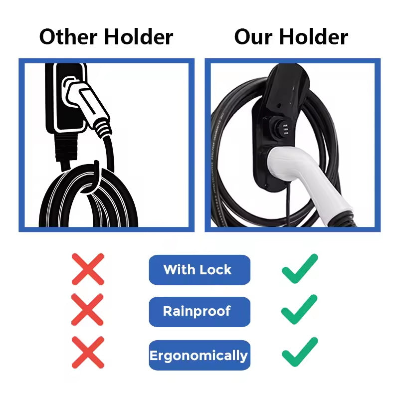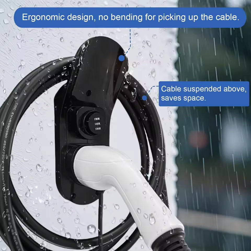 Diese Halterung ist speziell für Elektrofahrzeug-Ladestecker mit Typ 1 (US-Standard) oder Typ 2 (EU-Standard) entwickelt. Sie dient nicht nur als praktische Aufbewahrung für Ladekabel und Stecker, sondern schützt gleichzeitig vor unbefugtem Entfernen durch das integrierte Diebstahlschutzdesign.