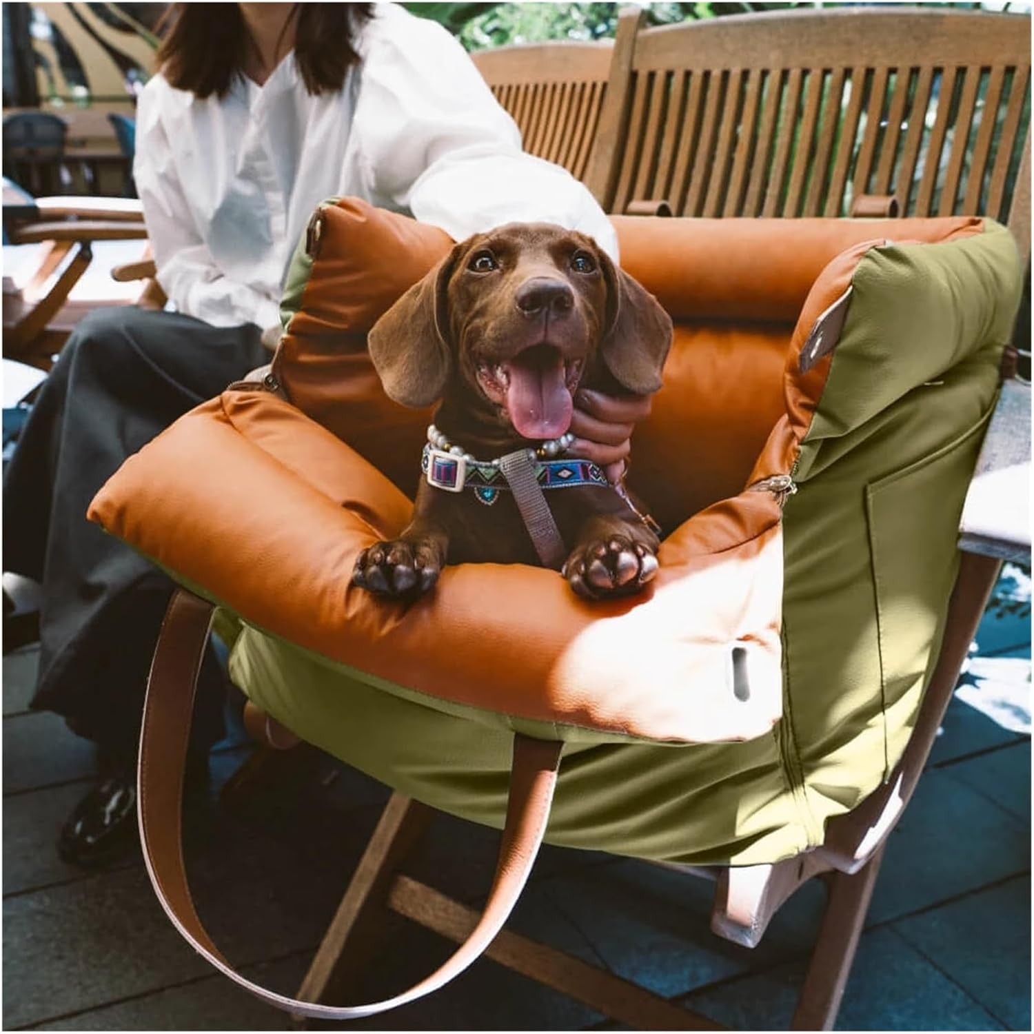 Praktisch und tragbar: Der Hundesitz ist mit einem breiten Ledergriff ausgestattet, der das Tragen erleichtert, und verfügt über praktische Seitentaschen, in denen Sie die notwendigen Dinge Ihres Haustiers wie Spielzeug, Snacks und mehr verstauen können. Er wurde speziell für kleine bis mittelgroße Hunde entwickelt.