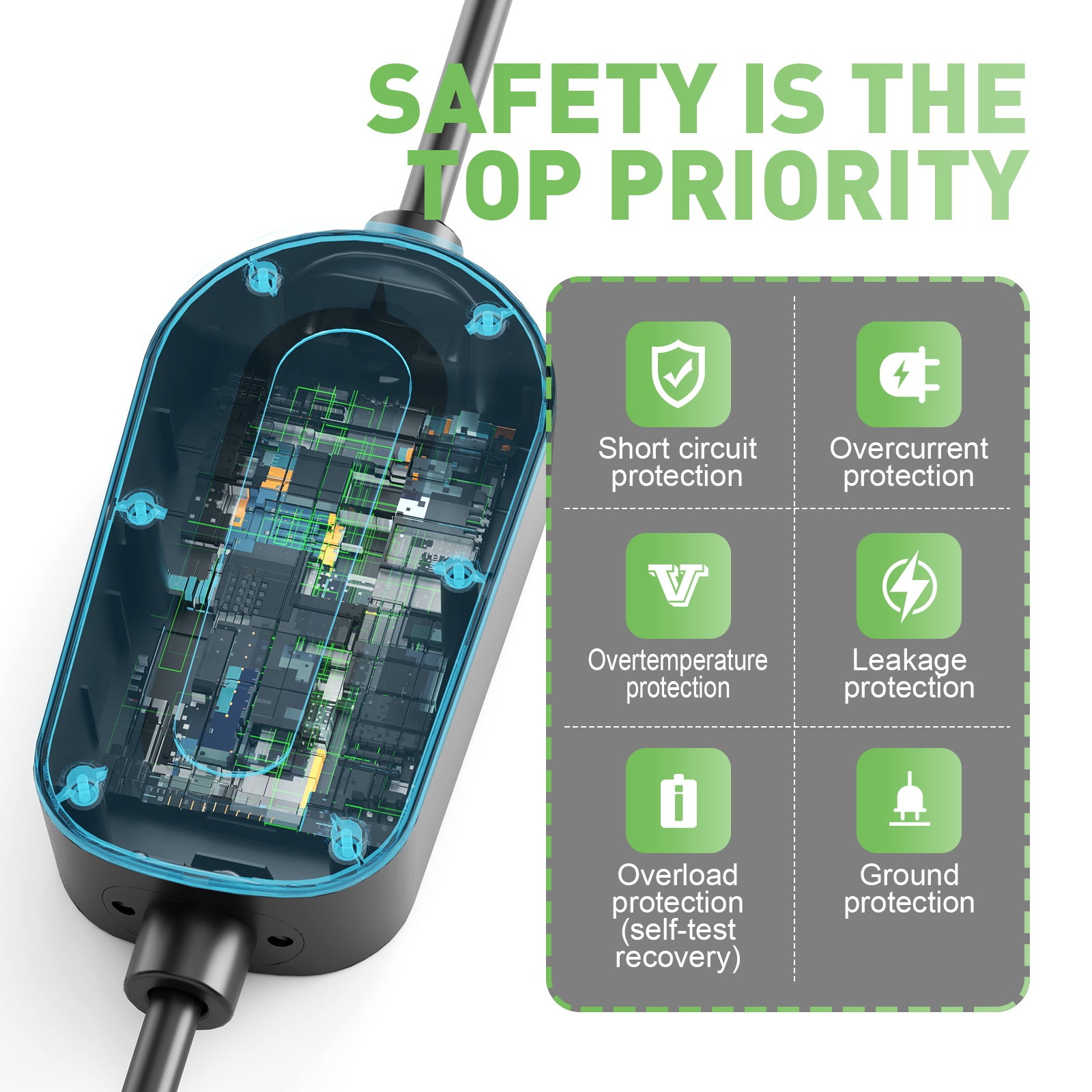 Der NOEIFEVO Ladegerät ist CE-zertifiziert und verfügt über einen integrierten RCD (Fehlerstromschutzschalter) zum Schutz vor Leckströmen. Zusätzlich ist das Produkt mit 10 weiteren Schutzfunktionen ausgestattet: Unterspannung, Überspannung, Überstrom, Leckstrom, Kurzschluss, Überhitzung, flammhemmend, Erdung, CP-Anomalie und Überspannungsschutz. Diese Funktionen gewährleisten ein völlig sicheres Ladeerlebnis.