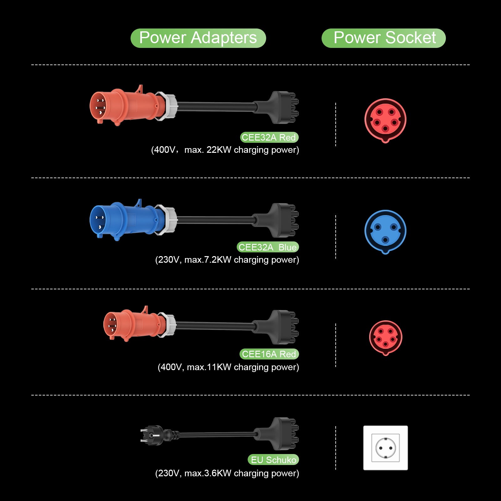 Die Reiseversion umfasst einen roten CEE32A-Stecker (22KW), einen roten CEE16A-Stecker (11KW), einen blauen CEE32A-Stecker und einen EU-Schuko-Haushaltsstecker.