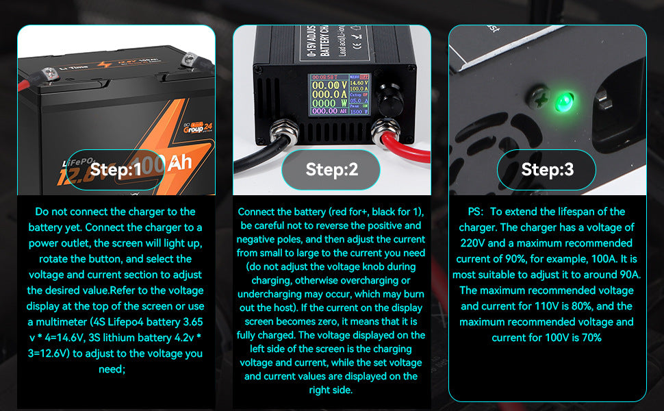 Hinweis: Um die Lebensdauer des Ladegeräts zu verlängern, beträgt die empfohlene Eingangsspannung 220V, mit einem maximal empfohlenen Strom von 90% der Nennkapazität des Ladegeräts (z. B. bei 100A, stellen Sie den Strom auf etwa 90A ein). Für 110V beträgt der maximal empfohlene Strom 80%, und für 100V sind es 70%.