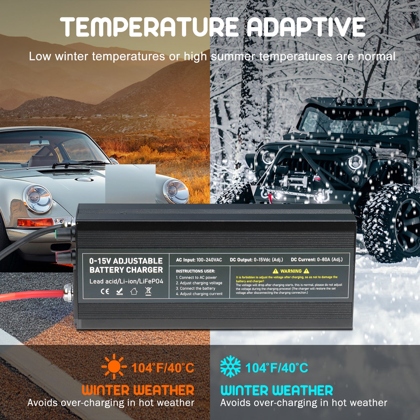 √ [Mehrere Schutzmechanismen] Das 0-15V 40A/60A / 80A Ladegerät verfügt über mehrere Schutzmechanismen, darunter Übertemperatur-, Überspannungs-, Kurzschluss-, Überstrom- und Niederspannungsschutz, um Schäden durch unsachgemäßen Gebrauch zu verhindern.